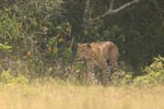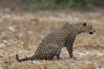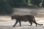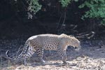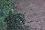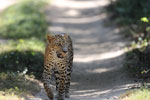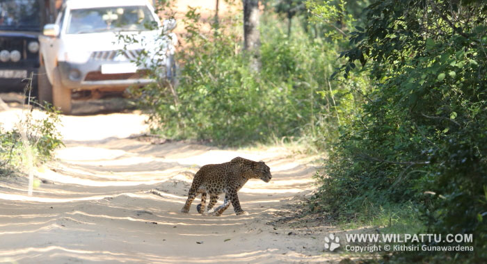 11.00am We observed fresh pug marks leading Kokkare Villu junction towards Nelum Wila where we had a glimpse of the leopard moving in the direction of Nelum Wila pitiya. We drove towards the pitiya but the leopard did not break cover. Thus drove back to the main road and spotted the leopard walking in the direction of Panikka Wila. Just then a safari jeep arrived at high speed and the driver applied the breaks upon seeing the leopard. The jeep stopped close to the leopard with sand flying all over the place. The leopard quickly moved in to the forest and I was only able to get a few photos of its hind as it entered the forest.