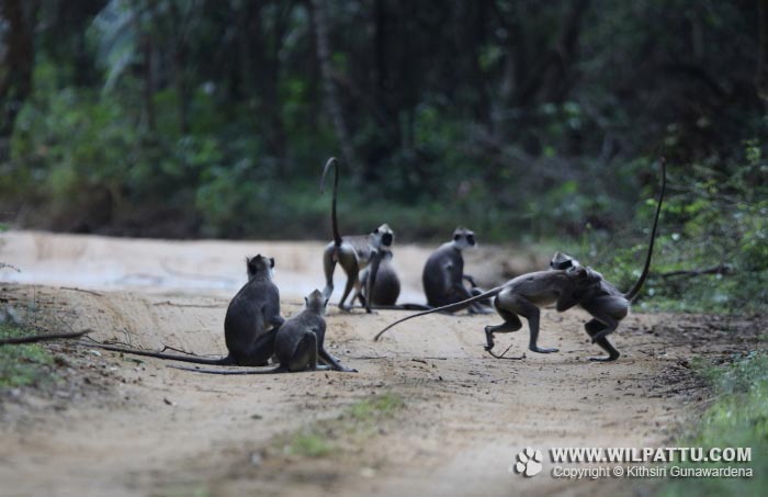 1.12pm a troop of Grey Langur seated on the road at Nelum Wila. The sub adult members of the troop engaged in play fighting as the adults watched.
