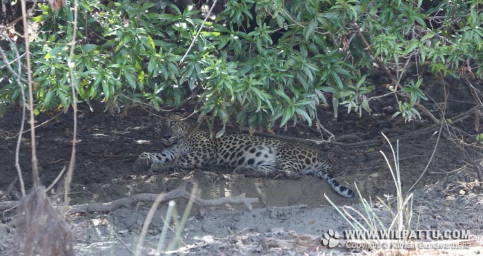 Around 2.50pm a Grey Langur gave out an alarm calls from the direction of Tala Wila and the leopard instantly stood up and moved in to the forest in the direction where the alarm calls emanated. After a few minutes both the vehicles drove back to Tala Wila expecting the leopard to arrive at the villu. After waiting for about 15 minutes without any success the second vehicle left and I decided to drive back on the Pomparippu road and was thrilled to see the leopard lying down on the road close to where it entered the forest. Unlike on the previous occasion it was now lying down with its head towards Tala Wila indicating that it would walk back. The leopard had walked 1200 meters on this road from the Tala Wila.