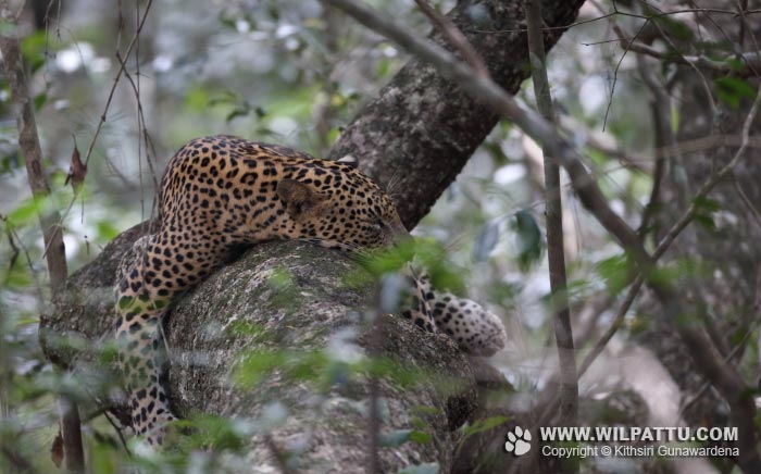 2.24pm we drove from Borupan junction towards Walas Wala and spotted a leopard just before Walas Wala. It was a female and was lying on the middle of the road. I stopped the vehicle about 50 meters from the animal to get a few photos for identification. Upon seeing another vehicle approaching from Walas Wala I moved my vehicle a little closer and started to photograph. The dappled light and the white sandy background made photography quite challenging. Unfortunately the other vehicle moved too close and the leopard moved in to the forest. Later upon examining the images I was able to identify the leopard as the Walas Wala Female 1 (WWFC 1). Her looked heavily pregnant with her stomach quite visibly swollen. I was thrilled to see this her as my previous sighting of this leopard was almost one and a half years ago on the 25th of July 2015 at Borupan Wila. N 08.41485, E080.02942