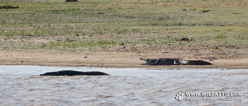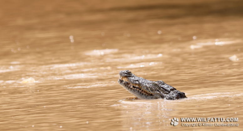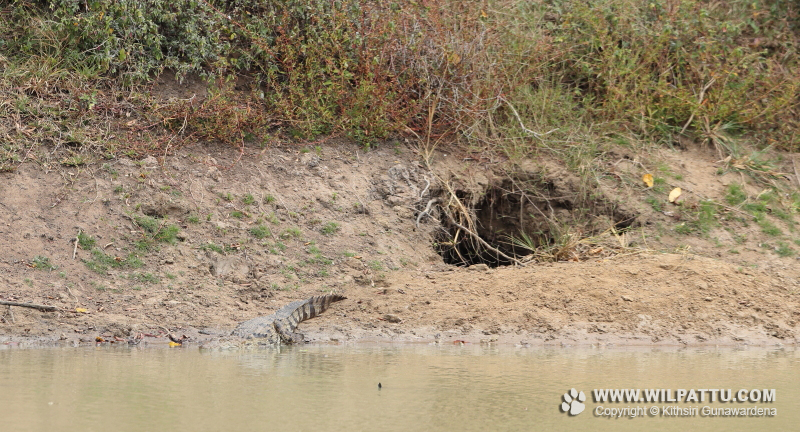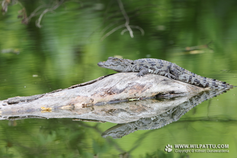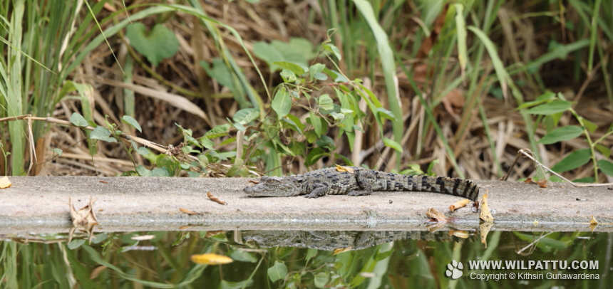 Arrived at the Jungle house at Wipattu around 10.30am. I counted 7 large Mugger Crocodiles at the water’s edge at Hunuwilagama Tank. The bungalow keeper informed me that a baby Crocodile had arrived at the garden pond the day before. The previous resident crocodile that used to feed on the left-over rice put out for the turtles had left some months ago. The tiny reptile was basking in the sun at the edge of the pond for some time and climed on to the log in the center of the pond.
