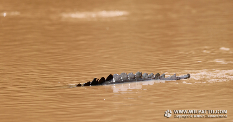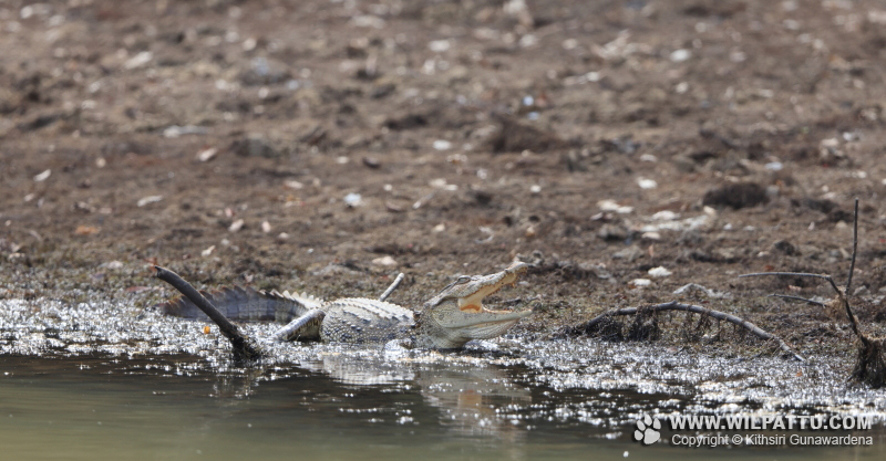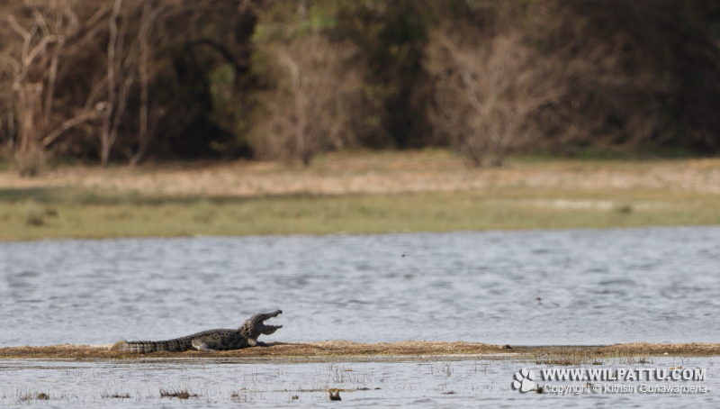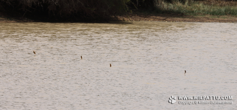 10.58am Arrived at the body of water located at the Palugahathure junction which gets separated from Periya Naga Villu during the dry season. This pool is referred to as the “crocodile pond” by the safari jeep drivers as a large number of Mugger Crocodiles can be observed at this location during the dry season. On previous occasions I had observed an interesting behavior of small fish that continue to leap out of the water in this pond even when not pursued by crocodiles. I was quite keen to photograph these fish to identify the species and find out the reason for such behavior as well as to capture the crocodiles in the act of catching fish.