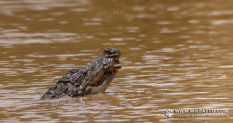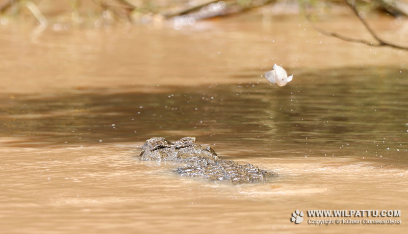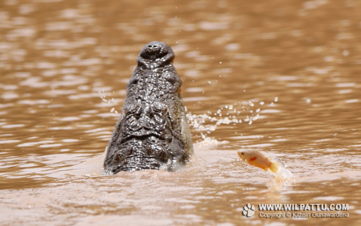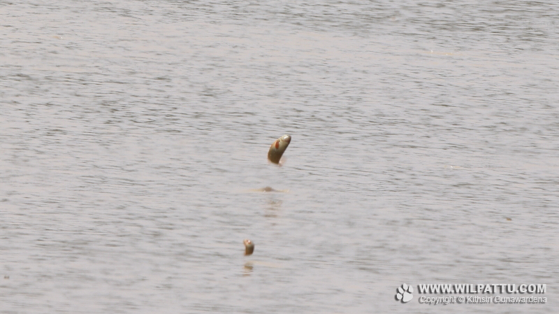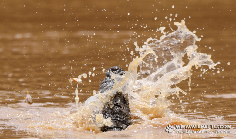 I have never observed any newly born crocodiles here. My safari jeep driver Amith also confirmed that neither he nor the other safari jeep drivers have observed immature animals except for the adults. Thus, it is clear that they do not breed here but congregate mainly to feed on the fish that gets trapped by the water level going down. These large reptiles dive down where only their tails are visible above the water and move up sideways with a splash trapping the fish in their jaws. As they do this some fish leap out of the water to escape. I wanted to capture this activity and also to photograph the fish as they jump out of the water. I told Amith to park the vehicle enabling us to see the pool. The crocodiles moved underwater as we approached but appeared after a while to engage in “fishing”. There were about 7 adult muggers and the larger reptiles chased the smaller ones that move towards the areas occupied by them. Each time when a crocodile moved under water the fish would jump out indicating the movement of the reptile. The challenge was to capture the crocodile and the leaping fish in the same frame. After more than one and a half hours of effort I was fortunate enough to capture a few images with the fish leaping out of the water to escape the crocodile. Except for one occasion where I captured a Thilapia leaping out to escape a crocodile, in all other images the species of fish was Climbing Perch or “Walking Fish” Anabas testudineus referred to as “Kavaiya” in Sinhala. This is a species of amphibious fish that can live for almost 6-10 hours even out of water. During rainy season they move long distances by crawling with the use of their pectoral fins and gill covers which has sharp edges in search of new water bodies to colonies. They are very hardy fish and can even withstand much greater levels of polluted water than most other species. Unlike on earlier occasions I did not observe the fish jumping out of the water at this pool other than to escape the crocs. This year due to a few unexpected heavy spells of rain received during the previous months the pool is till connected to Periya Naga Villu and is filled to the brim. The areas where the crocodiles used to bask in the sun are still under water.