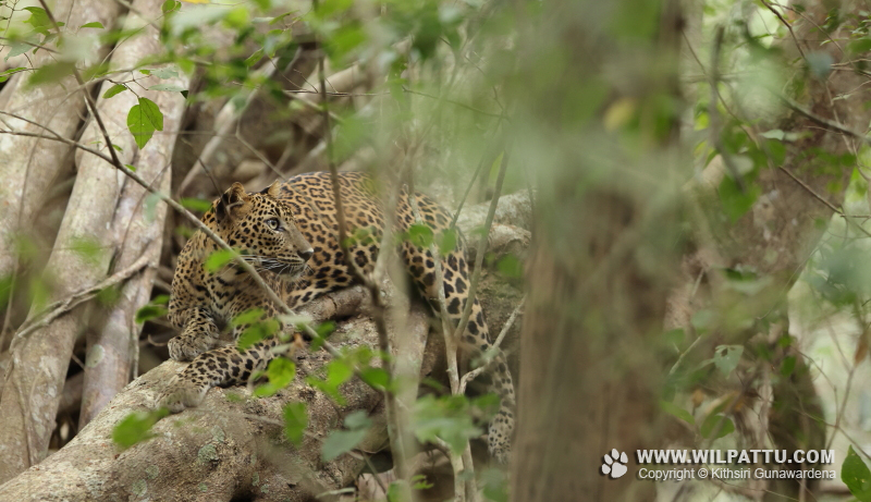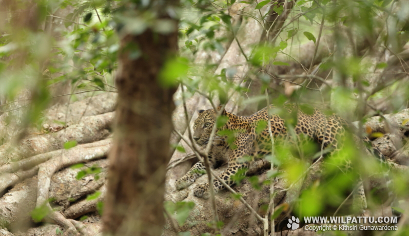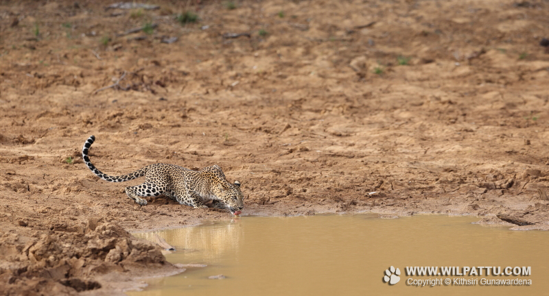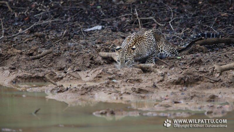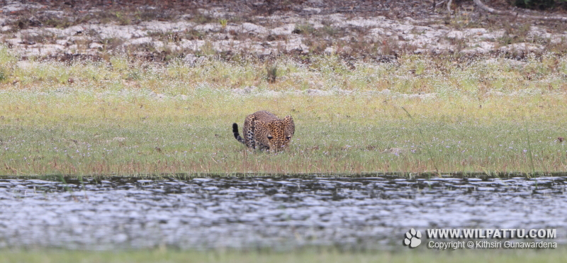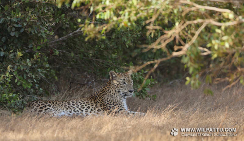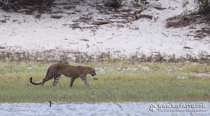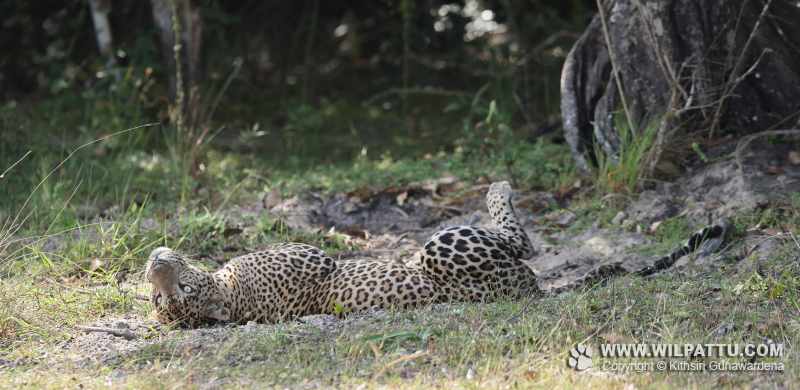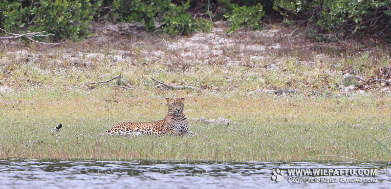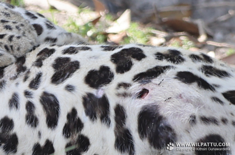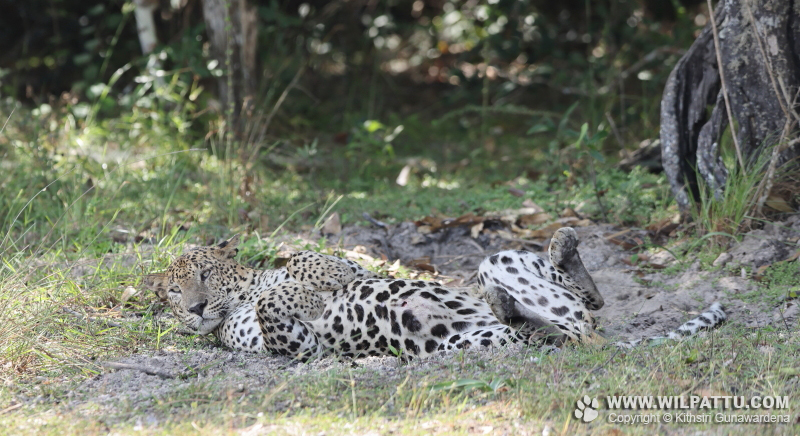 I stayed at this location until 3.30pm expecting further leopard activity but since there was none decided to leave.It was an adult male leopard sleeping at the edge of the water with its hind towards us. The vehicles had to drive in to the water to see the animal. We parked keeping a distance of about 40-50 meters from the animal to ensure he is not disturbed. After a few minutes he raised his head and started licking its stomach area. It was Nelum Wila Male 5 (NWMC 5) referred to as “Neluma” in Wilpattu. This is the current dominant male in the main Villu area of the park. During the last two months he had developed a bulge on its stomach and many were quite concerned about its health as it started to increase in size. This growth did not appear to trouble the animal and it looked in good health despite this growth. Considering these circumstance it looked like an Lipoma, which is known to be a benign fatty tumor found under the skin that causes no pain. This bulge had disssapered but there was a small opening of its skin which the animal was licking. I was pleased to observe that the contentents of its growth appear to have naturally drained off.