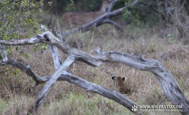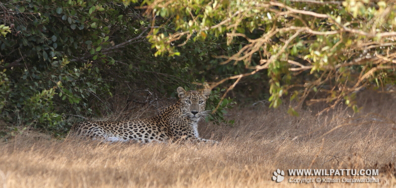 4.30pm 8 Spotted Deer and a Ruddy Mongoose at Madangaha Wala.The female leopard was lying on a slightly elevated part of the ground. It was partly covered by bushes. She did not appear to be relaxed as she kept on looking over her shoulder towards the forest. Later upon examination of her spot pattern I noted that it is Palukola Wala Female 2 PKWFC 2. This female was seen with her mother, Palukola Wala Female, between Thammanna ala and Palukola Wala originally in September 2022. She has recently moved towards Maradanmaduwa which perhaps is the reason for her agitated behaviour.