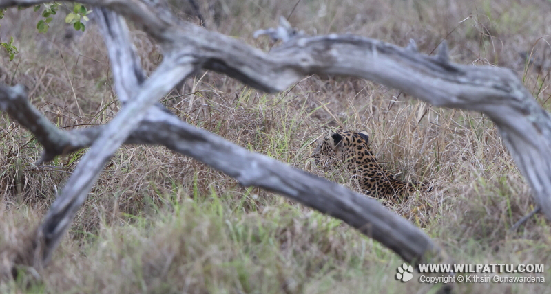 9.45am two Leopards at Kuruttupandi Villu. N 08.43847, E 079.98241The young male leopard was lying down under the shade of a small tree across the villu. It was difficult to spot the leopard with the naked without the aid of binoculars. He would occasionally raise his head to investigate any thing that distracts him or shift position to move from direct sunlight falling on him but go back to sleep. Upon examination of the spot pattern, I noted that this is Kuruttupandi Male 1 (KRPMC 1), one of the second litter cubs of Manikrala Uraniya Female 1. He is around one year and six months of age now and is often seen together with its female sibling. Leopard cubs stay in the company of their mother for about two years. Despite having got a few images I was keen to remain at this location due to the possibility of seeing its sibling and the arrival of their mother. Thus, I parked at the edge of the area enabling other safari vehicles to move out once they have seen the leopard.