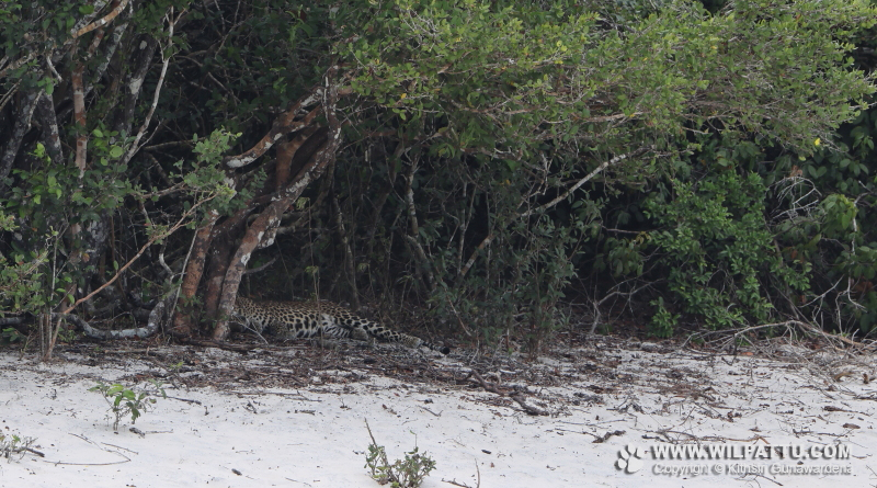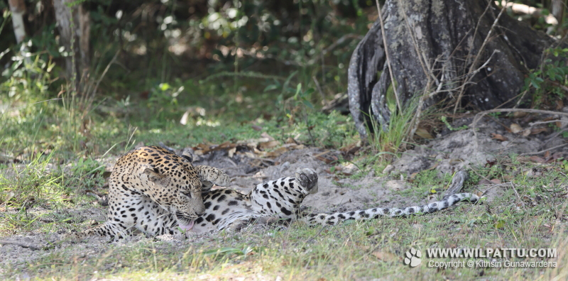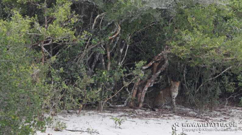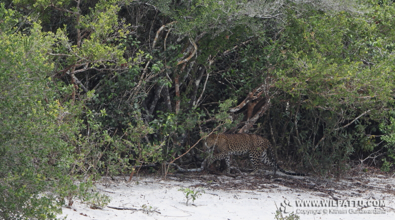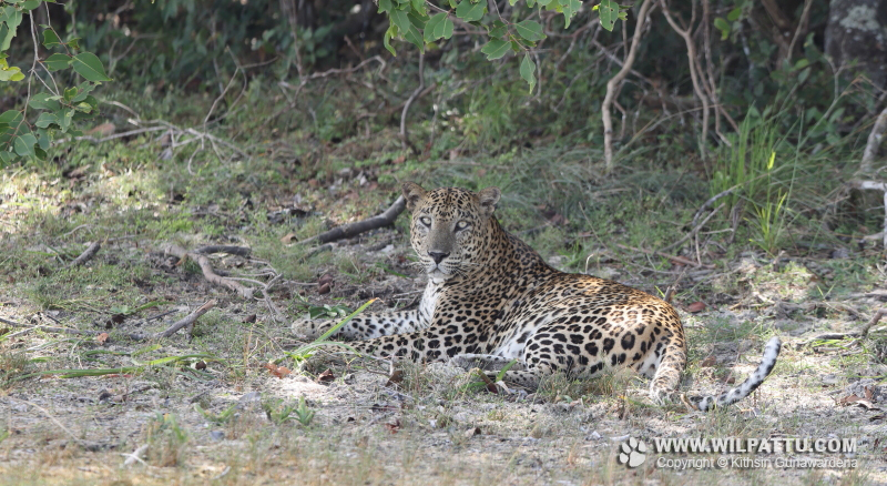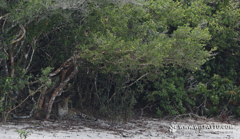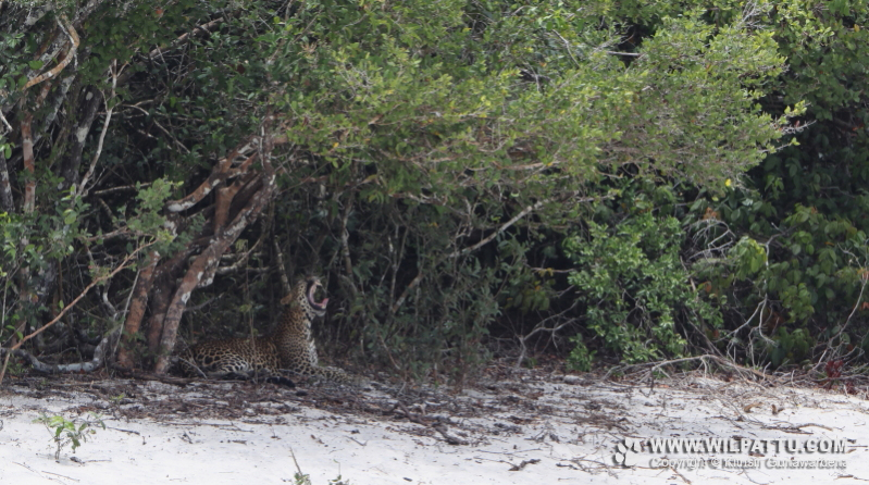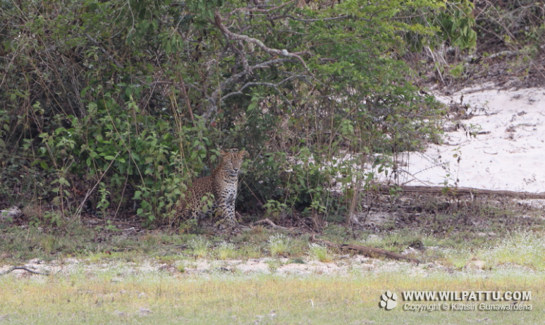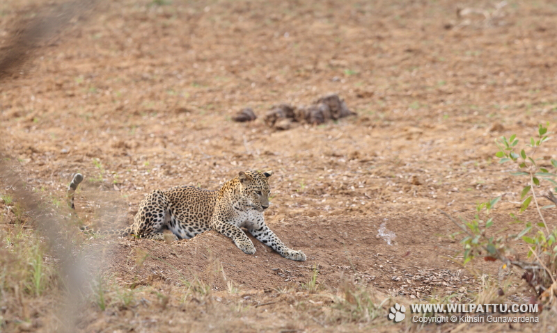 4.16pm a Black-naped Hare ran on to the road at Kuruttupandi Villu.Having photographed the female I drove back to check on the leopard that was sleeping on the Ficus tree. The jeep drivers informed me that it had descended from the tree and had walked into the thicket. I decided to drive down to the villu, expecting the leopard to break cover. After a few minutes a fine young male leopard moved out of the forest to lay down on a white sand patch. I had received images of this cub with its mother and its sibling that I just photographed. It was the male cub of the second litter of Manikrala Uraniya Female 1 (MRUF 1). Despite being of the same age (one year and 4 months) difference in size of the male was obvious. I was thrilled to have capture both these cubs that had eluded me from mid last year. As this is my first sighting of this cub, I named it Kuruttupandi Male 1 with the code KRPMC 1 for the purpose of my study.