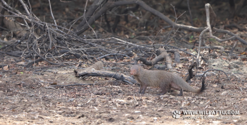 10.20am two Ruddy Mongoose between Periya Villu and Maila Villu.I was keen to visit the Villus by the side of the road up to Pukkulama junction. The first water body beyond Malila Villu is Aalam Villu the next is Thamakka Villu and the third is Thanga Villu. All these had fair amount of water with many species of water fowl such as Lesser Whistling Teal and Painted Storks.
