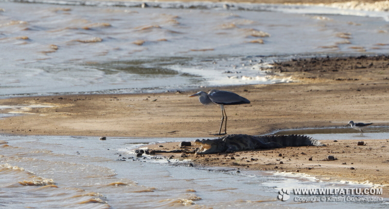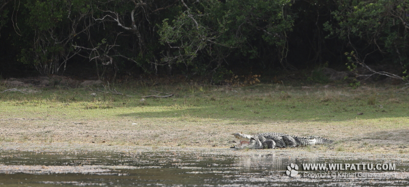As it was the dry season in Wilpattu many species of mammals arrive at the Hunuwilagama tank throughout the day in search of water. Thus, I decided to remain at the bungalow without going to the park to photograph animals that would come to this tank. There were many large Mugger Crocodiles basking in the sun at the water’s edge. I counted nine of them.