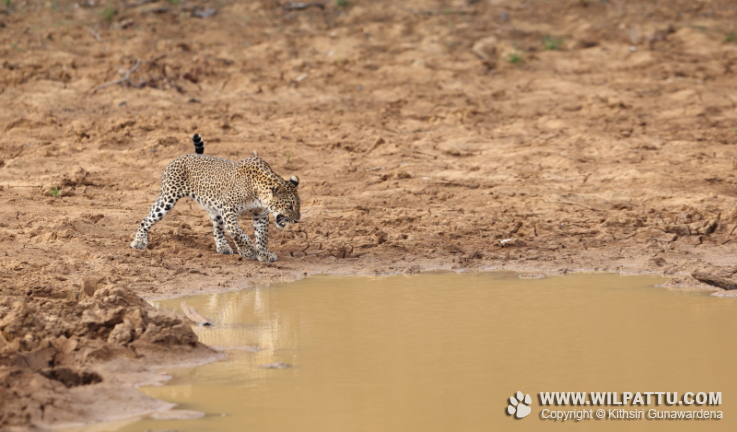 1.45pm a Ruddy Mongoose at Hertah Hamy Wala.The Leopard was seen seated below the road. Safari jeep driver Randika had spotted the leopard. It was apparent that the cat wanted to cross the road in order to drink water. So we reversed our vehicles about 50 meteres to create adaquate space. Within a few minutes the leopard walked up to the edge of the road and catiously walked across down to Palu Kola Wala. It was a young female leopard of about 3 years of age. This water body had receeded but still had plenty of water. The leopard inspected the the concreat pond which hardly contained any water but did not drink.