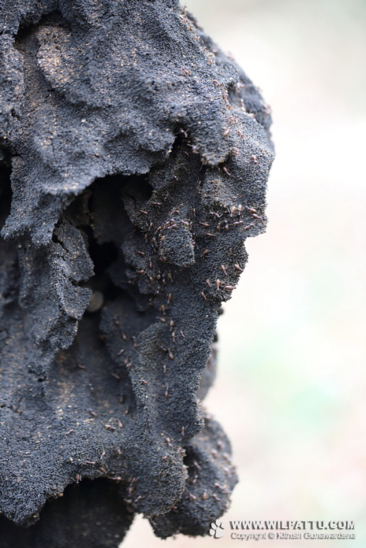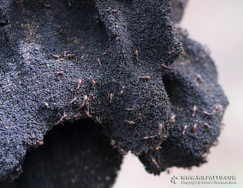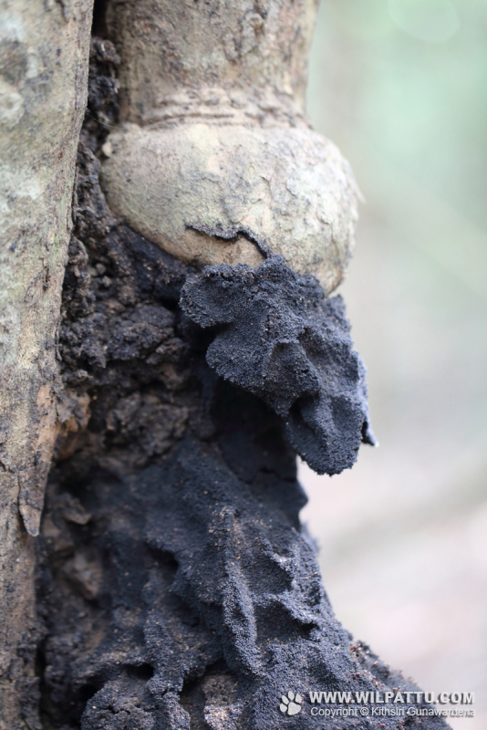 6.05pm Left the park.9.36am a colony of tree dwelling Black Termites at Panikkar Villu. These insects build their nests on crevices of trees. They are reffered to as “Geriya” in sinhala and the soft earth that is used by them to build their nests are referred to as ‘Geri Pas”. It is said that this earth is used in some preparations of traditional medicine. The earth used by these insects turn black in coloure due to the black liquid they emit from their bodies. I have observed the movement of these insects on the forest floor. The majority of the colony consisits of smaller warker termites and they move in a long line with the larger soldier termites standing guard along the way. The path that they take becomes blackish.