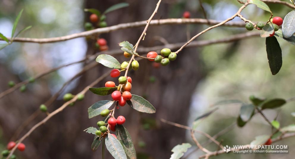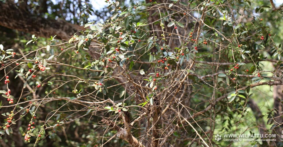 11.29am I noticed a small tree with red berries that I was not familiar with close to Palu Kola Wala. The shape of the fruits and how they were placed on the thin branches were quite different. Later upon consulting Dr. Samantha Suranjan I was happy to note that it is Gardner’s Drypetes Drypetes gardneri referred to as “Gal Weera” or “Eta Weera” in Sinhala. This is an endemic species with a “Near Threatened” conservations status. This is my first record of this species in the park.