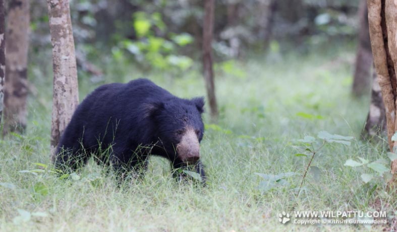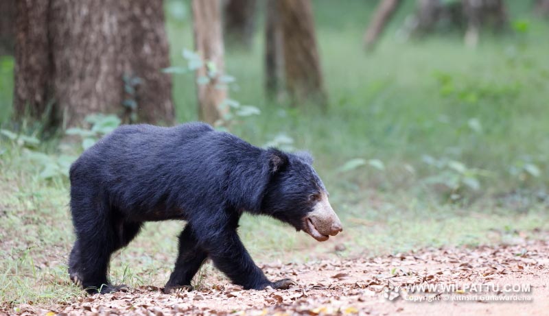1.30pm I spotted a male Sloth Bear walking towards the road at Thambioluwa and reversed the vehicle to give the animal space. He across the road ahead of the vehicle and started to sniff the ground where there was a termite hill. His head was covered by grass, but I could hear him blowing air into the opening of the termite nest. Sloth Bears use an interesting method to dig out termites and ants. They use their long claws to break into the nest mound and blow away the excess earth. Once this is done, they suck out the insects through a gap in their front teeth which gives out a whistling sound. The rains make the hard exterior of the termite hills softer and easier to break into. Many of these termite hills get predated during the rainy season by Sloth Bears and Pangolins to feed on termites.
