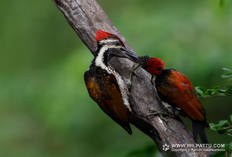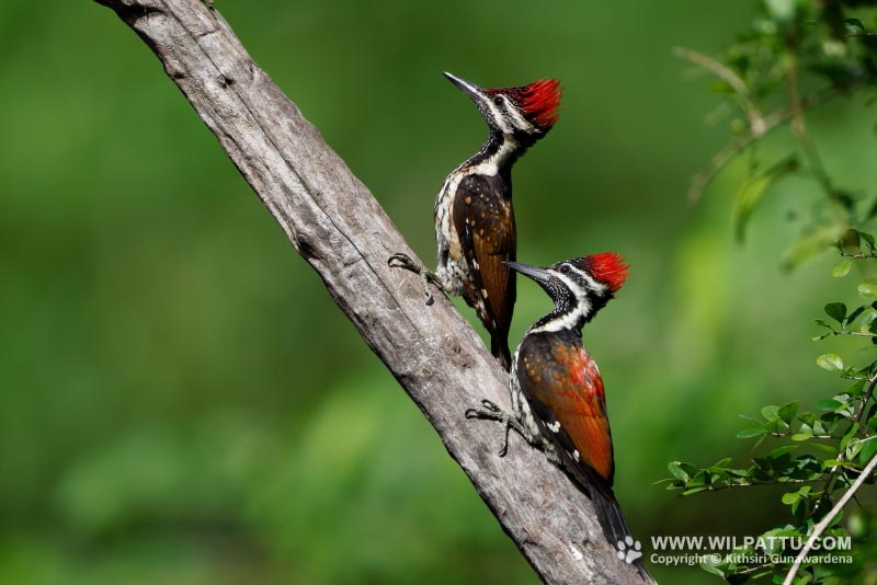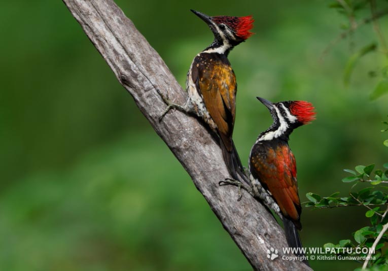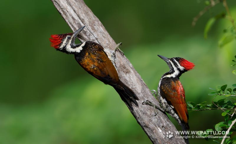 I have observed Golden-backed Woodpeckers with varying degrees of yellow to orange on the mantles, backs and primary feathers in and around Wilpattu. All these forms have broader white facial markings compared to the narrow facial marking of the endemic Red-backed Woodpeckers found throughout the southern parts of the island. On the 30th of June 2019 I photographed a nesting pair of this species in a village referred to as Rajanganaya, track 16 “tharuna govipola” which lies a few kilometers south from Wilpattu. Male of this pair had an orange back while the female’s back was a very deep orange very close to red. It is very likely that the two species hybridize where their territories meet producing these varied coloures.