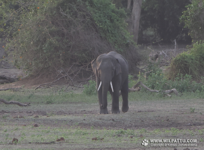 10.07am a bull elephant in musth at Periya Uppu Villu. He was at a distance but decided to walk straight at us up to about 15 feet from the vehicle but having moved close he walked away with no hostility.I wanted to move along the main road towards Mollikulama prior to any other vehicle to observe the animal foot prints on the sandy road. We drove almost up to Pukkulama junction. I was quite pleased to observe many fresh prints of Elephant, Leopard and Sloth Bear at many locations along the road indicating a good diversity of animals occupying this area of the park.