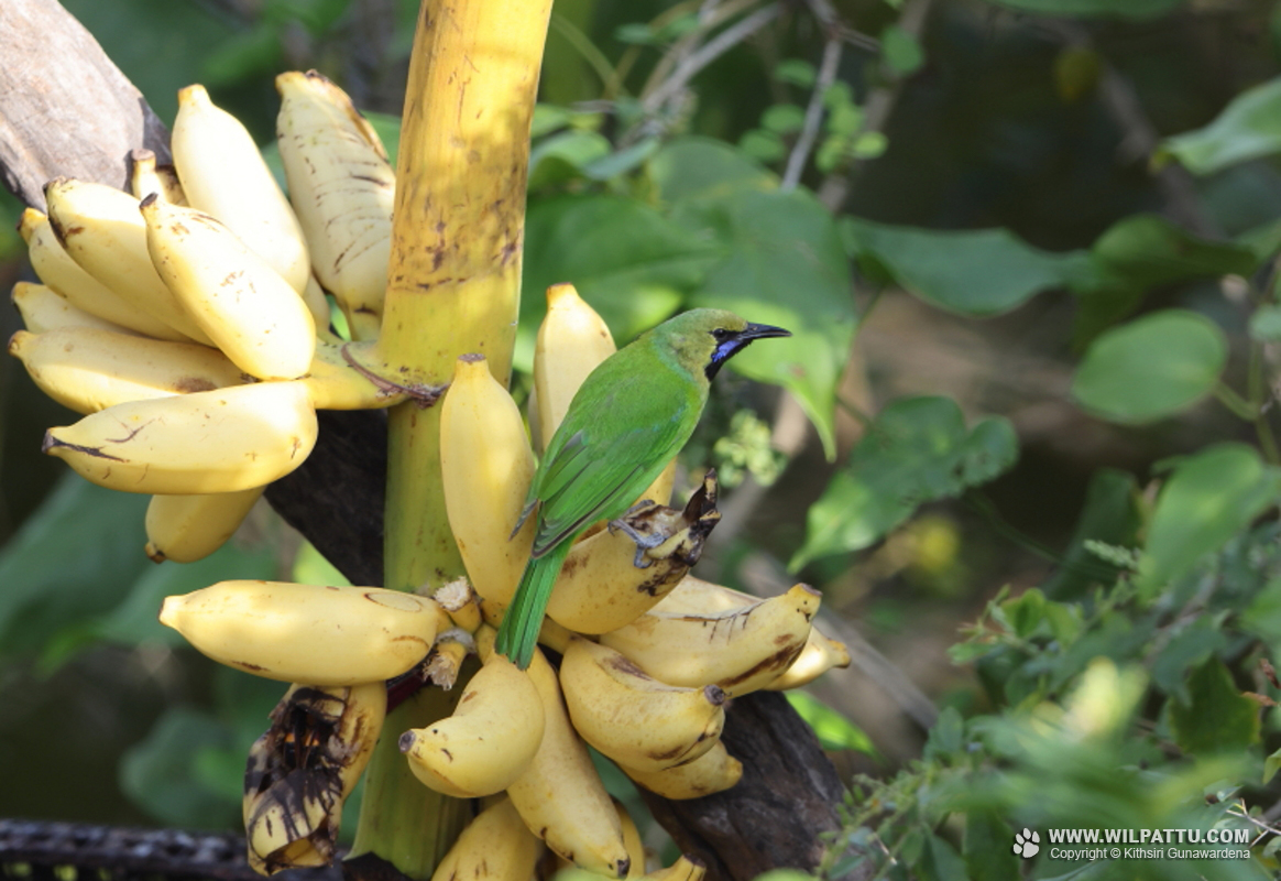 31th August 2025Other than the left-over rice from the kitchen which is left by the pond at dusk for the turtles I have instructed the caretaker to leave a few sour bananas every morning at the bird feeder in the garden. I always take some extra fruits each time I visit. Usually most is consumed by the resident pair/family of Malabar Pied Hornbills. Many species of birds are attracted to these bananas. including the Small Indian Civets Cats and Common Palm Civets that feed on the left-over rice. I purchased a bunch of over ripe sour bananas on my way to Wilpattu and placed it in the bird feeder. I wanted to do this for some time to see what other species of birds would be attracted. The resident pair of Malabar Pied Hornbills gorged on the bananas the previous day as well as in the morning and left with plenty of fruits still left on the combs. The previous night the aroma of the ripe bananas attracted the Common Palm Civets, Small Indian Civets and many species of Bats. Once the Hornbills left a Jerdons’s Leafbird flew in and fed on the left-over bananas.