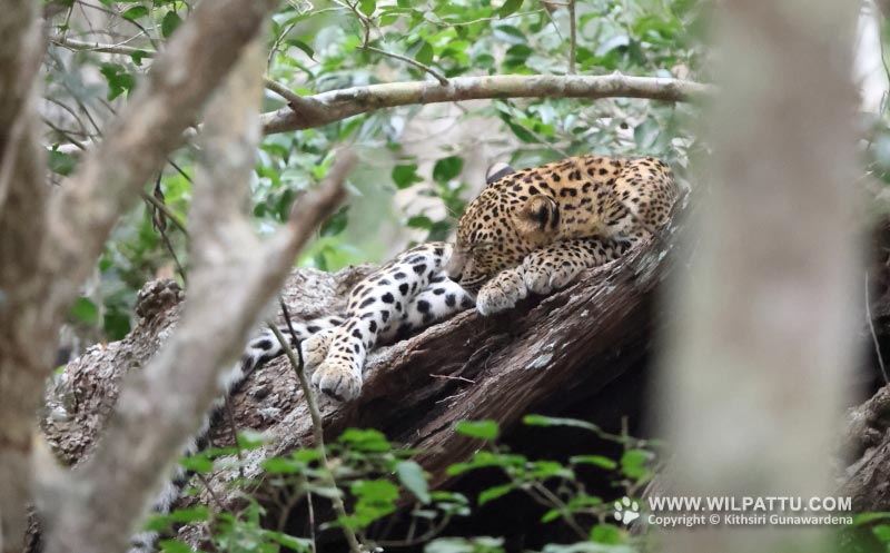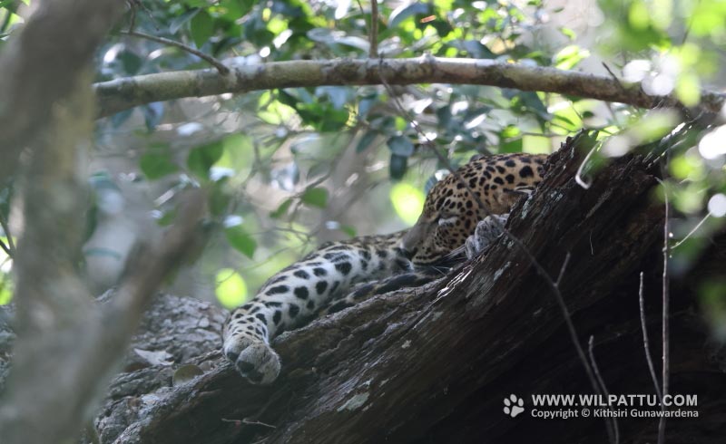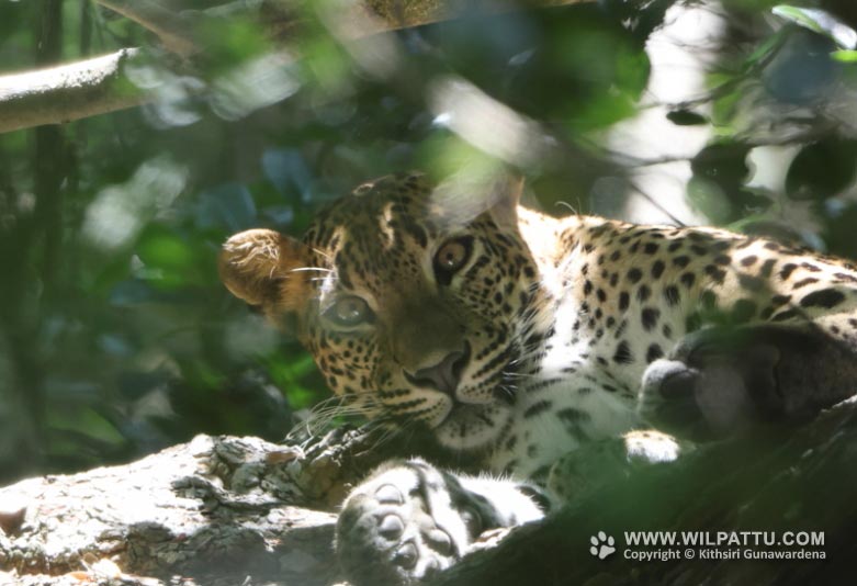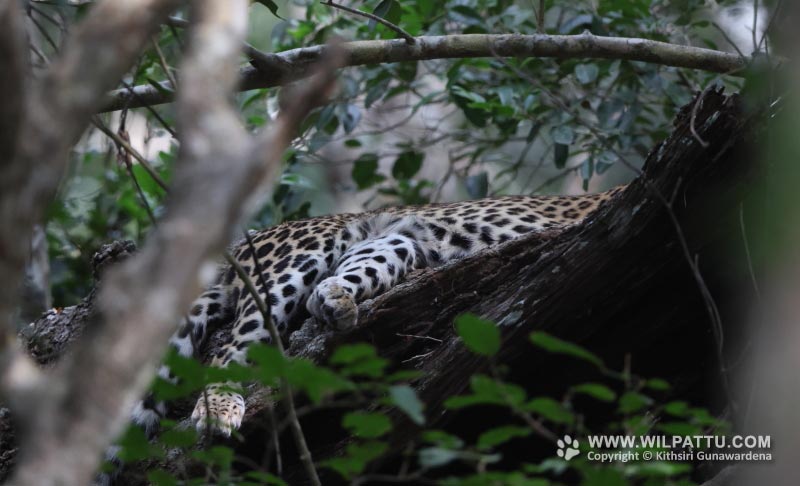 It was Maha Wewa Female 2, the same leopard that was found at this location yesterday. She was sleeping on the same tree with only half of her body visible. Around 4 pm as I pulled up to take my turn, she moved her position allowing me to get a few good images. I hurriedly clicked a few and left permitting others behind me to take their turn.