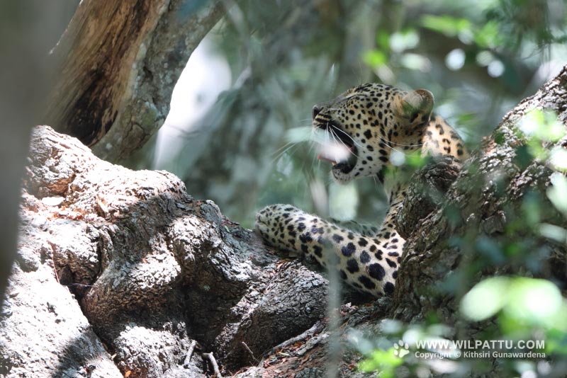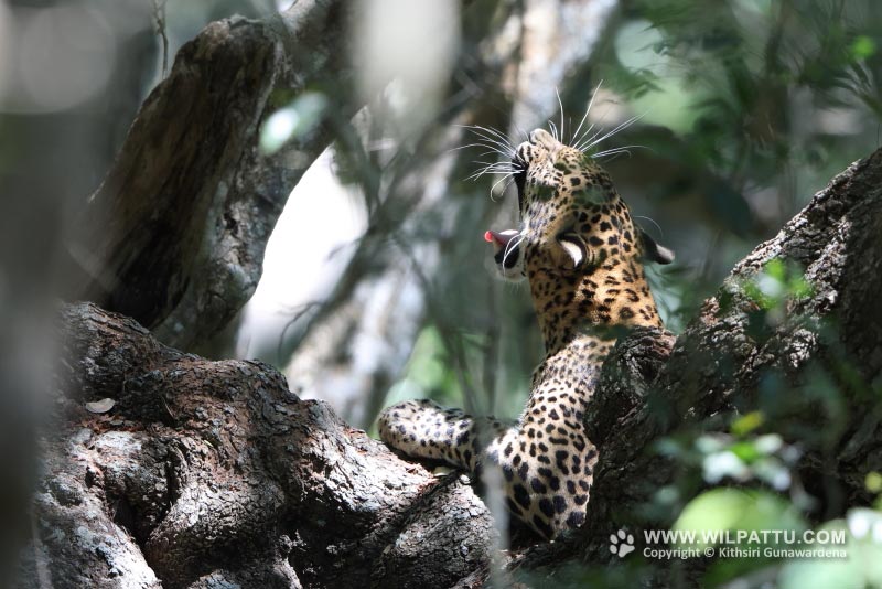 It was a young female cub of about 7 months of age. The leopard was lying down on a bent “Palu” tree about 100 meters from the road at Maha Wewa. The feline was only visible through the foliage from one narrow opening, and the vehicles had to queue up and take turns to get a view. She was sleeping with her head down and out of sight. After a few rounds of spending about five minutes and returning to the end of the queue I was fortunate to have my turn when she raised her head. I managed to take a few images of her looking in my direction and the two sides of her face during another turn, enabling me to identify the leopard. Around 1.45pm she climbed down and disappeared into the forest. I had received images of this cub and her male sibling from Pathum Neeliya on the 9th of January 2026 and listed her in “Leopards of Wilpattu – Guest” section as Maha Wewa leopard 7. Since this is my first sighting I named her as Maha Wewa Female 2 with the code MHWFC 2.