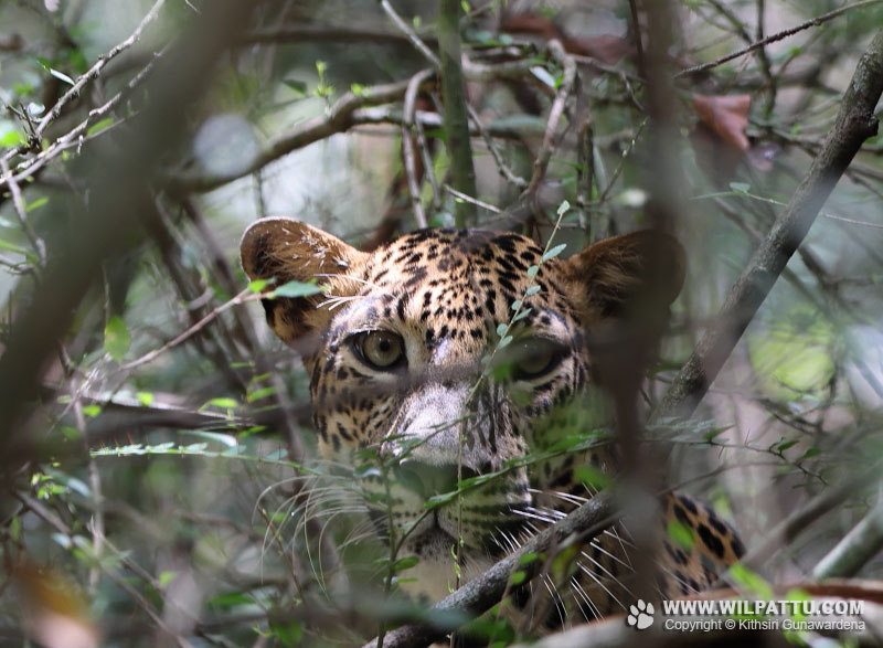 On my way back to Kombansanchipooval I was pleased to have met with a leopard between Nelum Wila and Panikkar Villu. It was a young male leopard and moved into the forest the moment I saw him. After having waited for some time, I drove up to the point where he entered the forest and was thrilled to have spotted him seated among the foliage. Only its head was visible, and I managed get one image before he moved into the forest. Later upon checking its spot pattern I was pleased to note that this is Panikkar Villu Male 2 PVMC 2 on my site. This is one of the cubs of the second litter of Panikkar Villu Female 2. My first sighting of this leopard was on the 16th of October 2022 with its mother at a Spotted Deer kill at Panikkar Villu bungalow junction. This is my second sighting of this young male.
