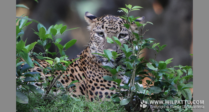 The female leopard was lying on a slightly elevated part of the ground. It was partly covered by bushes. She did not appear to be relaxed as she kept on looking over her shoulder towards the forest. Later upon examination of her spot pattern I noted that it is Palukola Wala Female 2 PKWFC 2. This female was seen with her mother, Palukola Wala Female, between Thammanna ala and Palukola Wala originally in September 2022. She has recently moved towards Maradanmaduwa which perhaps is the reason for her agitated behaviour.