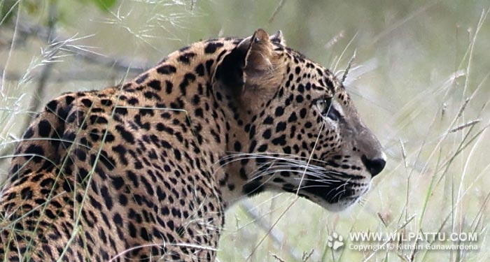 It was a young male leopard and was stalking some prey about 30 meters from the road. He was not disturbed by the presence of 4 safari jeeps and was focused on its prey that was not visible. We observed him for about 10 minutes, but he did not look in our direction even once. Later upon comparing its spot pattern I was pleased to identify him as the young male leopard I have listed under Leopards of Wilpattu – Guest section Walas Wala Leopard 2. He is the male cub of the first litter of Walas Wala Female 4. I have seen him on 3rd September 2021 with his mother and its female sibling, Walas Wala Female 5, but was not able to photograph. This leopard is now one year and 11 months old. As this is my first sighting of this young male where I was able to photograph, I decided to name him Walas Wala Male 4 despite the location with the code WWMC 4. (With safari jeep driver Sithum)