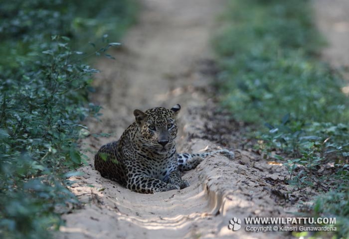 Around 2.50pm a Grey Langur gave out an alarm calls from the direction of Tala Wila and the leopard instantly stood up and moved in to the forest in the direction where the alarm calls emanated. After a few minutes both the vehicles drove back to Tala Wila expecting the leopard to arrive at the villu. After waiting for about 15 minutes without any success the second vehicle left and I decided to drive back on the Pomparippu road and was thrilled to see the leopard lying down on the road close to where it entered the forest. Unlike on the previous occasion it was now lying down with its head towards Tala Wila indicating that it would walk back. The leopard had walked 1200 meters on this road from the Tala Wila.