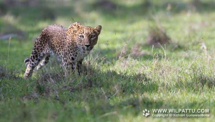 I drove to the Pomparippu end of Tala Wila to photograph the 50+ Spotted Deer herd that was grazing. Upon my return spotted an adult female leopard walking across the open plains. The leopard turned and looked in my direction once but continued to walk until she moved into the forest. Later upon examination her spot pattern I identified it to be Kombansanchaipooval Female 1 (KSPF 1).
