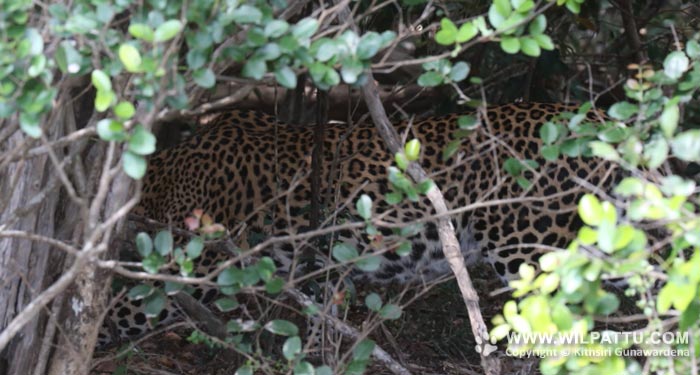 Less than 100 meters prior to reaching the Mara Wila camp site area we spotted a leopard sleeping under a bush by the side of the road. I stopped the vehicle and turned off the engine. It was a young female Leopard and was not disturbed by us being parked about 25 feet from where she was lying down. I estimated her age to be around 3 years. We were able to observe and photograph the Leopard for about 40 minutes before she was alerted by two male Indian Peafowl and stalked them through the forest. The Peafowl detected her presence and flew off. She walked across the campsite area and moved in to the forest. This is my first sighing of this female and I named her Mara Wila Female 1 (MRWF 1) (with guide Tissa Ratnayake)
