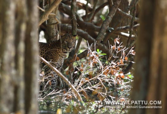 Even though the animal could be seen through the foliage I had no clear view adequate for any photography. I decided to wait a while expecting the leopard to brake cover. After some time, the jeeps ahead of me indicated that the leopard in walking in my direction. Around 7.55am I observed a young male through the foliage. Fortunately, he climbed on to a tree for a brief while permitting me to get a few record images through the foliage. Later upon examination of its spot pattern I noted that this is Boraluwala Male 1 (BRWMC 1). He is now around 2 years and two months.